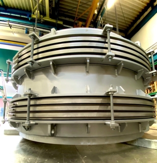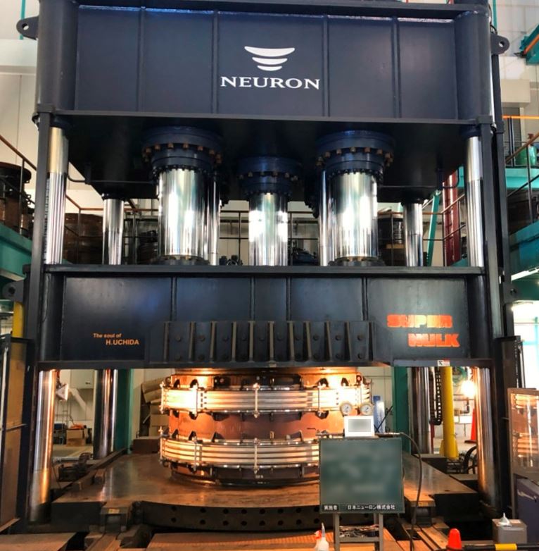 NEURON品質を製鉄所のシンボルへ 2020.08.27 Product 某製鉄所様の高炉改修工事向けに伸縮管継手を納入いたしました。 高炉とは鉄鉱石から還元反応によって酸素を除去し銑鉄を作り出すための 巨大な塔のような反応容器で、製鉄所のシンボルともいわれます。 高炉で使用される伸縮管継手は高温高圧に曝されるため 過酷な環境に耐え得る相応の品質が要求されます。 本案件では製品の性能を確認する耐圧気密試験に際し 世界最大級の液圧成形機『SUPER HULK』が大活躍いたしました。 (エンジニアリング本部 西勇也 記) ディテール 製品全体像 耐圧気密試験