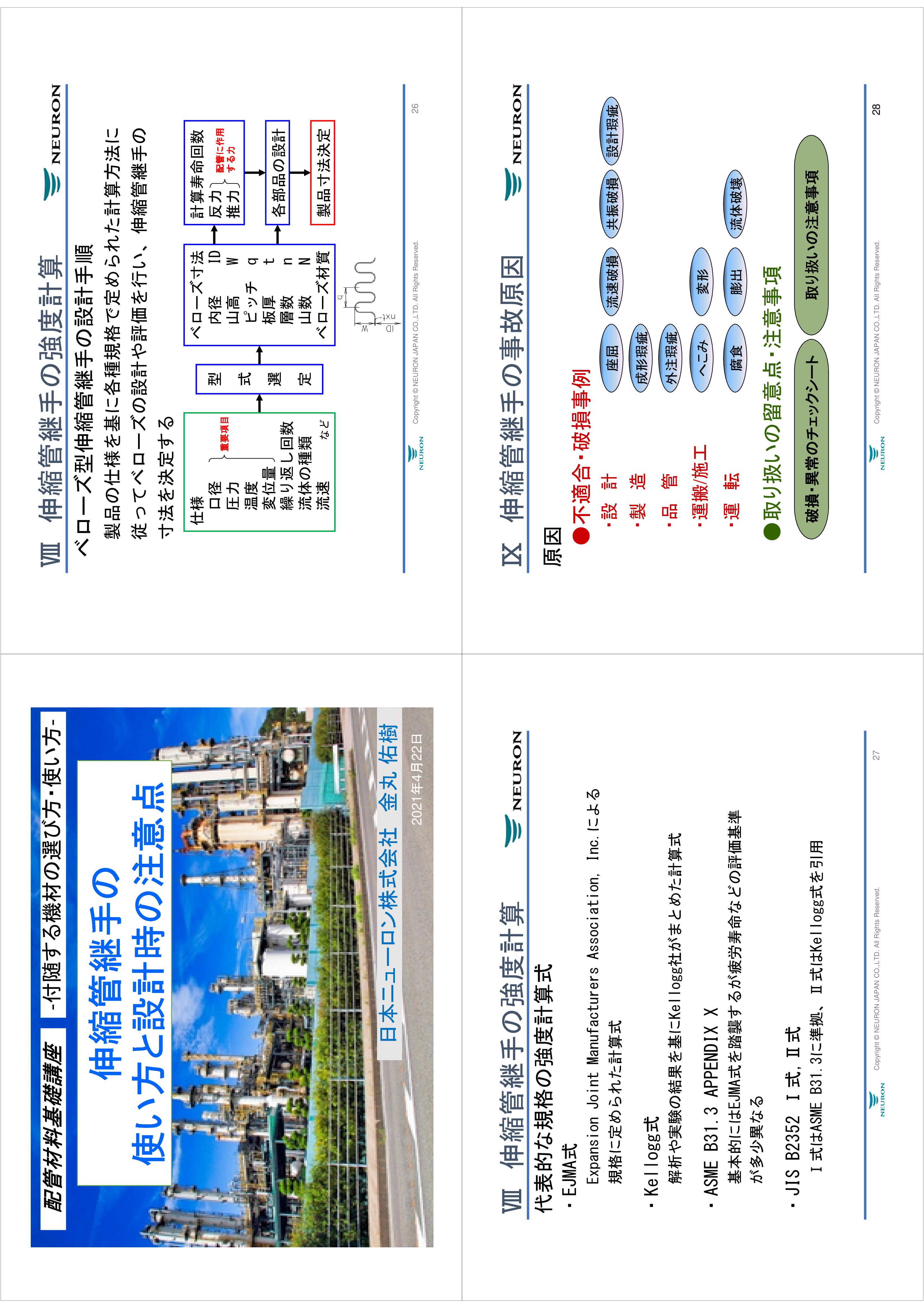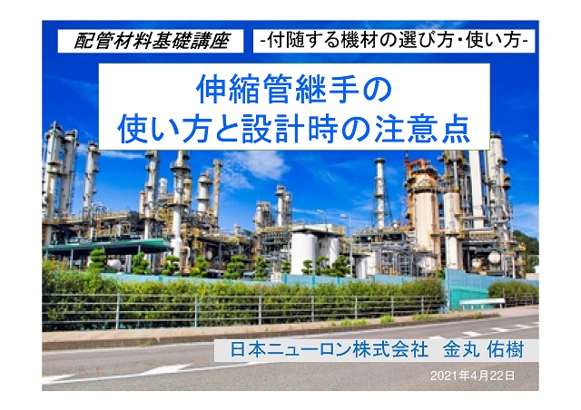 4月22日、日本工業出版㈱主催の日工セミナー2021が開催され、「伸縮管継手の使い方と設計時の注意点」という演題での講演を、当社エンジニアリング本部 設計解析グループ 金丸が務めました。