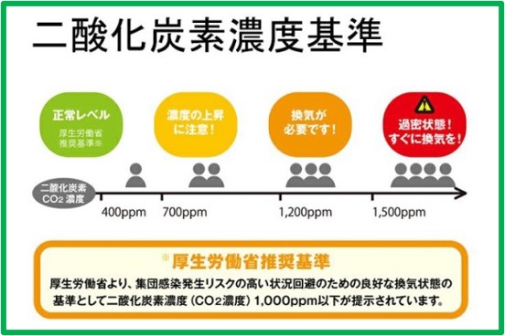 また厚生労働省のガイドラインで定める 「必要換気量」 二酸化炭素濃度1000ppmを超えると