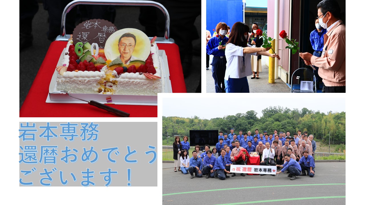 ◎祝!還暦!岩本専務 2022.05.31 Local Events 2022年5月20日、当社の専務岩本が還暦を迎えました? 社員一人一人が、一本のバラとともに日ごろの感謝の気持ちとお祝いメッセージを伝えました。 遠慮深く恐縮しきりの専務でしたが、とても素敵な笑顔を見せてくれました。 これからも社員一同を、厳しい中にも慈愛心のあるご指導よろしくお願いいたします!! 岩本専務、おめでとうございます!! (品質保証部 中川 洋一 記)