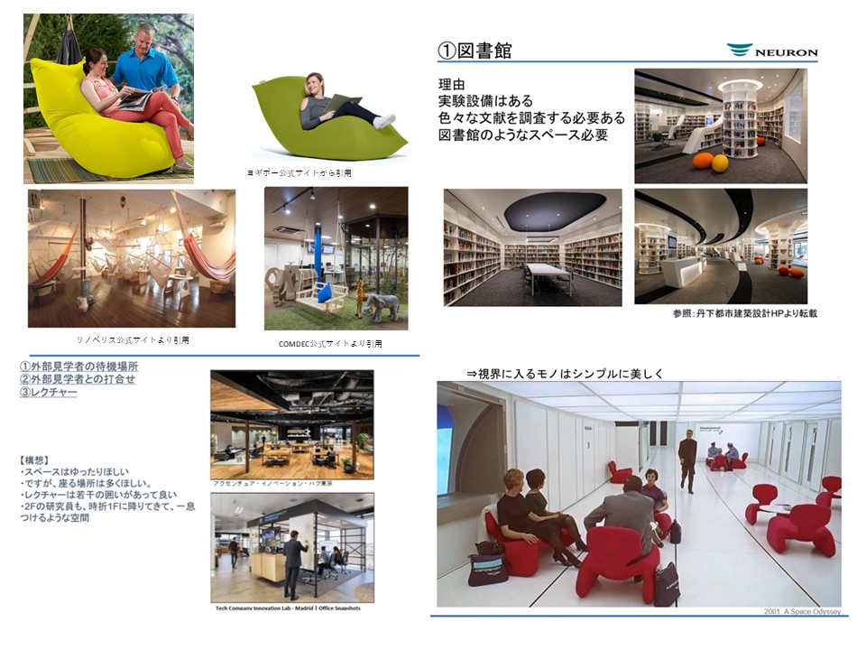 “遊び”からひらめき出せる場所」等を融合しながら働くことで、イノベーションを創出する研究所にすべく、