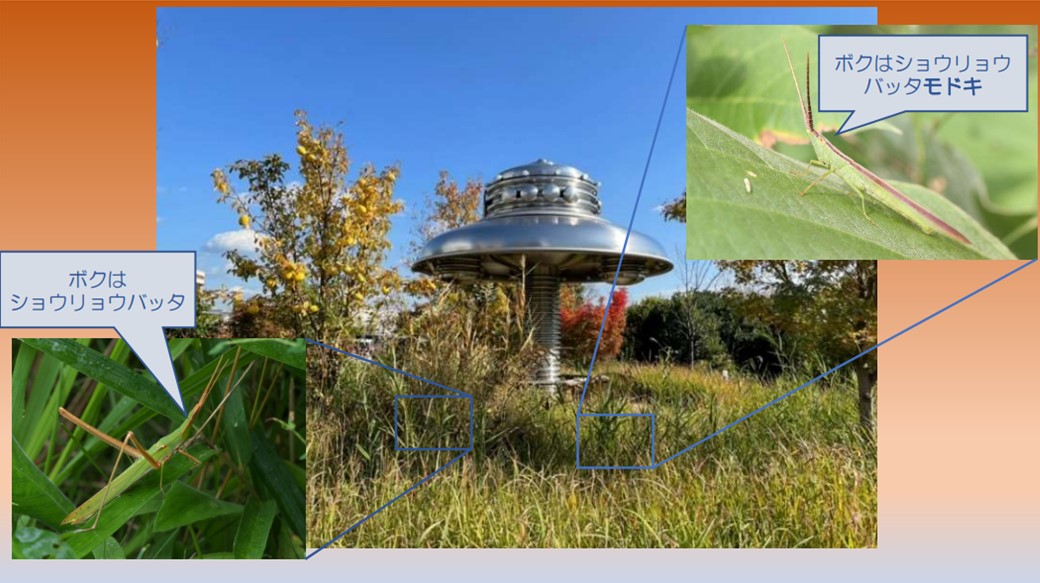そんな、ショウリョウバッタモドキは、京都府版レッドデータブックにおいて絶滅危惧種に指定されています。当社ビオトープでは生物相調査を2年前より行っており、ショウリョウバッタモドキの生息・繁殖が確認されました。