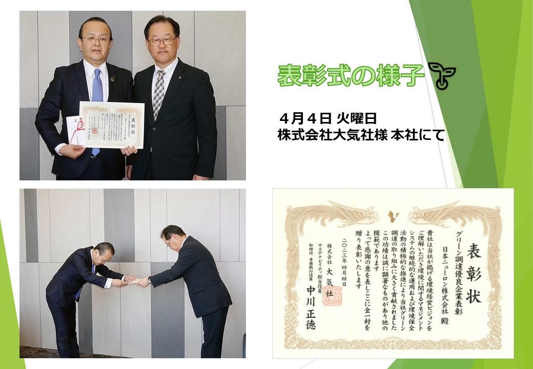 この度、株式会社大気社様より2022年度“グリーン調達優良企業”に選出いただき、