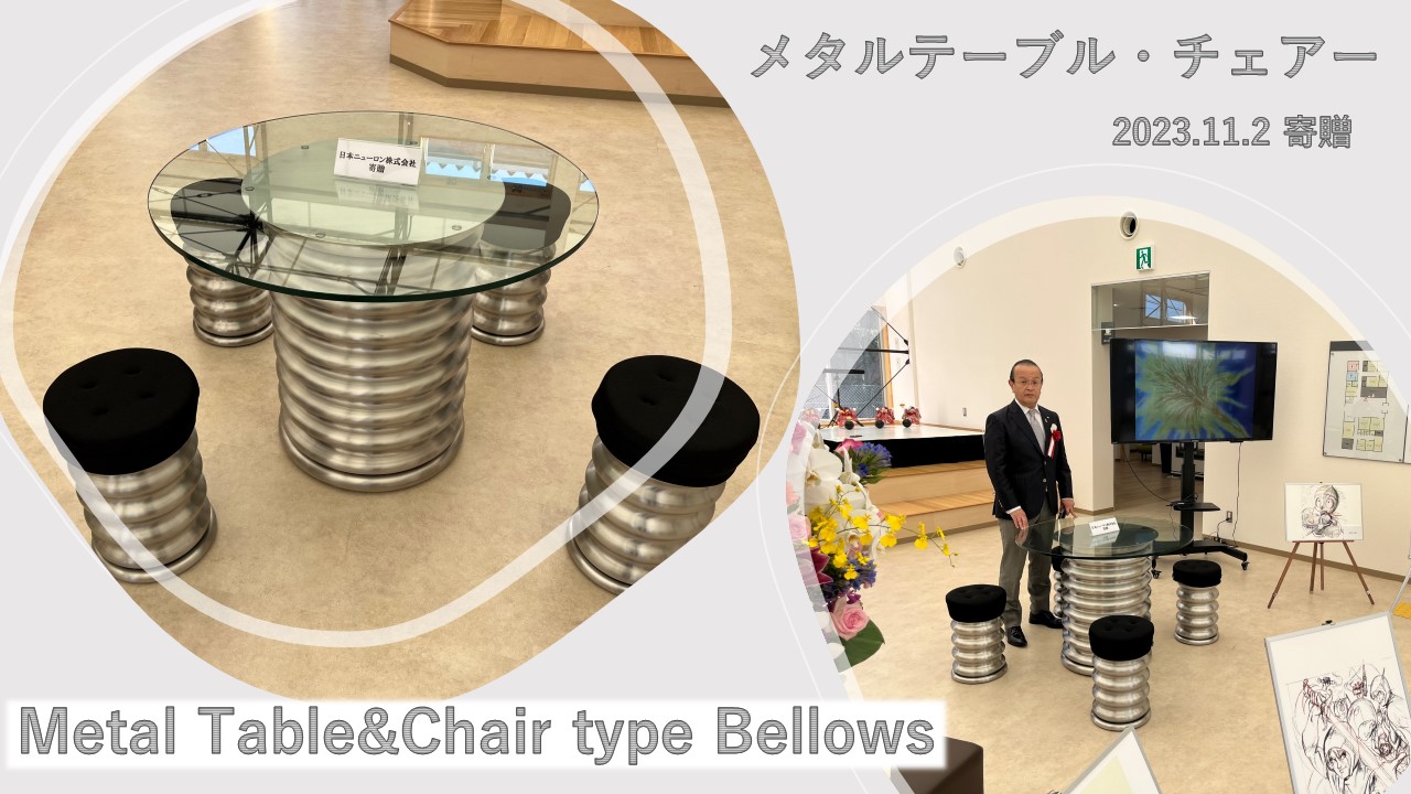 開所にあわせましては当社からベローズ成形加工を活用した「メタルテーブル・チェアーセット」を寄贈いたしました。